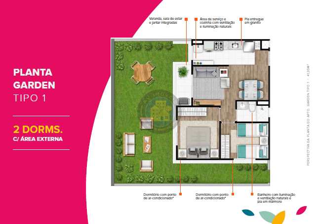 Planta tipo Garden com área externa, 41,35M² / 43,83M²